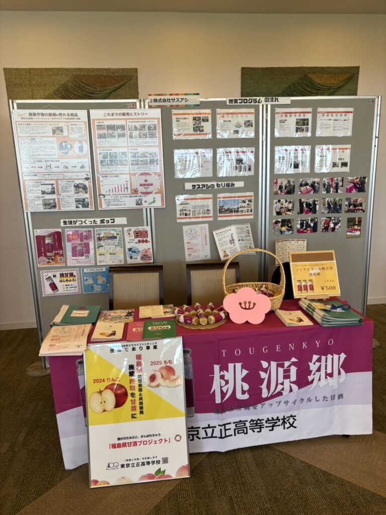 ブースでは、東京立正高校での探究学習「新商品開発プログラム」を中心にご紹介しました。受講した生徒さんたちの写真や実際の授業資料などは特に来場者の皆様にもご興味を持っていただき、本取り組みの今後の発展に向けても充実した対話ができました。実際に開発した桃甘酒「桃源郷」を手に取ってくださる方も多く、感謝申し上げます。